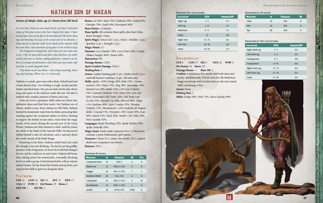 All along the text you find examples of Vasana's Saga, a Gloranthan adventurer that is created and then goes on to live adventures that serve as examples of play. Like Anathaym in RQ6, Cormac the Pict in RQ3 or Rurik in RQ2, this is an awesome way to learn and clarify the rules. However, these little narratives go beyond just game examples, and they are useful to visualise the world these characters are treading. What's more, they give a glimpse of the kind of adventures you can enjoy in this setting. They remind me of the diaries of the merchantBiturian Varosh in Cults of Prax, the old supplement for RQ2. Later on you can actually see Vasana's game stats together with those of her companions, since they are included for you to use as player or non-player characters. They are the same as the ones in the RuneQuestQuickstart, but one more is included here.