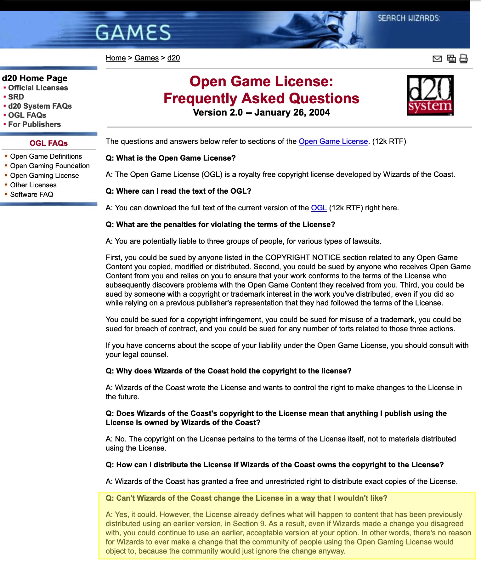 Yeah my public opinion is that Hasbro does not have the power to deauthorize a version of the OGL. If that had been a power that we wanted to reserve for Hasbro, we would have enumerated it in the license. I am on record numerous places in email and blogs and interviews saying that the license could never be revoked.