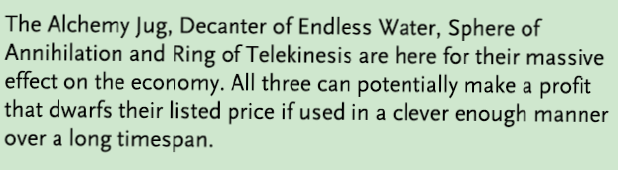 By the way, Alchemy Jug: 6,000. Sphere of Annihilation: 15,000. Ring of Telekinesis: 80,00