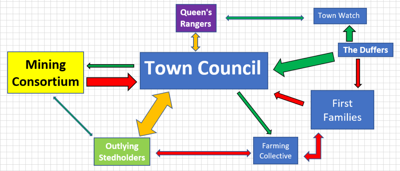 So all the blue boxes are parts of the Council faction, but just having one box wouldn't have captured the interplay between those parts. There is an additional layer of individual relationships that seemed like too much, so I left it out (it would be covered in the NPC sketches). The arrows show positive, negative, and conflicted relationships as well as directionality, when I thought it mattered. There are also some sub-faction elements in the mining consortium that I forgot about. Anyway, this is the sort of thing I like to use, although ideally it would look somewhat neater.