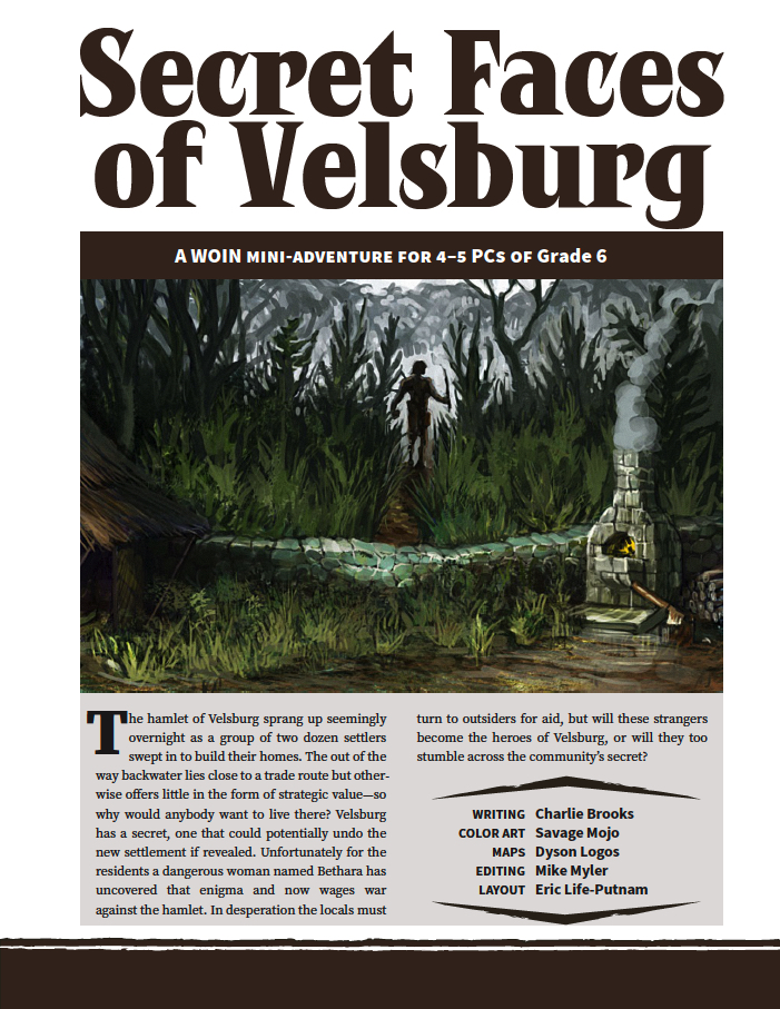 Secret Faces of Velsburg. While traveling through the wilderness the adventurers come across a small hamlet plagued by a recent rash or murders committed by 'The Ghost'. The longer the party stay in Velsburg however, the quicker they realize that the supposedly bloodthirsty spirit preying upon the settlement is not the remote village's only mystery. In this sidequest to save Velsburg the PCs are confronted with a shocking truth underpinning it all and are presented with a dire dilemma: is it worth saving?