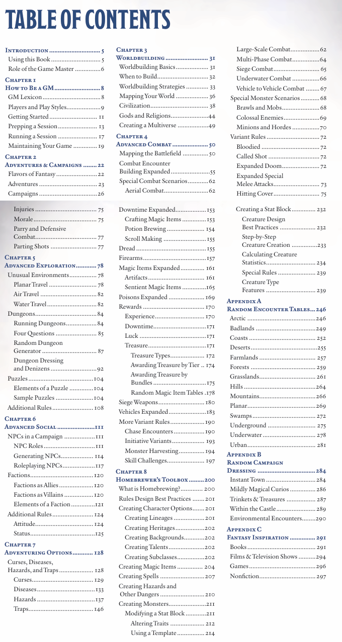 The Game Master’s Guide (304 pages) is kind of a quasi third Core book. It is not required but there is a ton of great info in it to help improve your game in hundreds of ways.