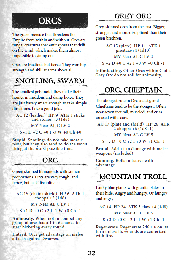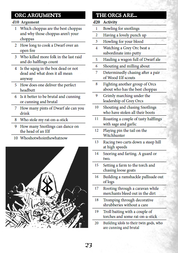 I'm going to replace some of the details in that table as I develop the expanded Orc bestiary and vocabulary. Squigs will need to go, and maybe choppas, but none of them are key elements, so no problem. I'm not worried about the Gods unless I use the names or published details about them, which I don't plan to. Honestly, the table stuff is more like easter eggs than necessary detail anyway.