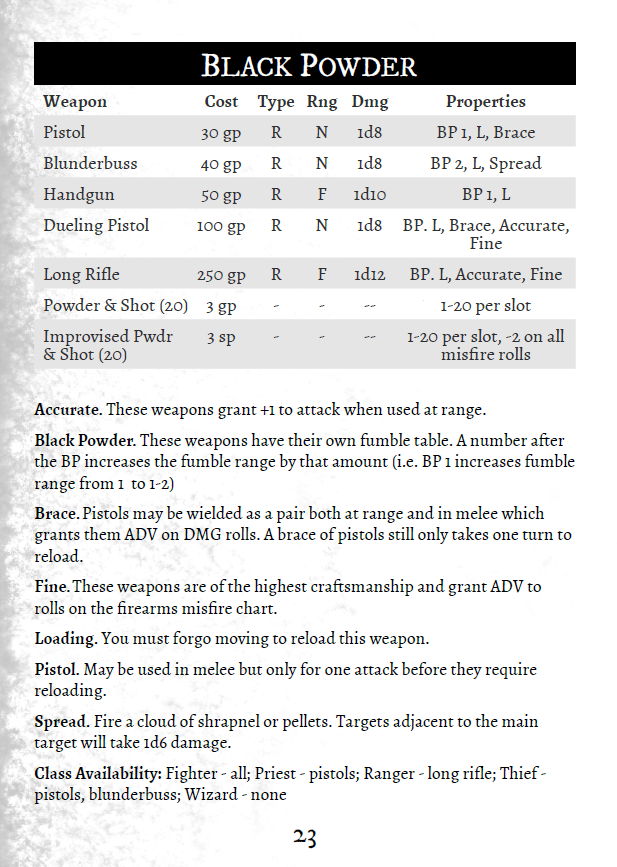 Rather than opining on what I think Shadowdark's Spirit is (for which everyone will have a different opinion) I would rather ask you what you want your game to feel like and what you want those characters and weapons to mean and then work from there.In the spirit of Shadowdark's system, how would you handle black powder weapons?