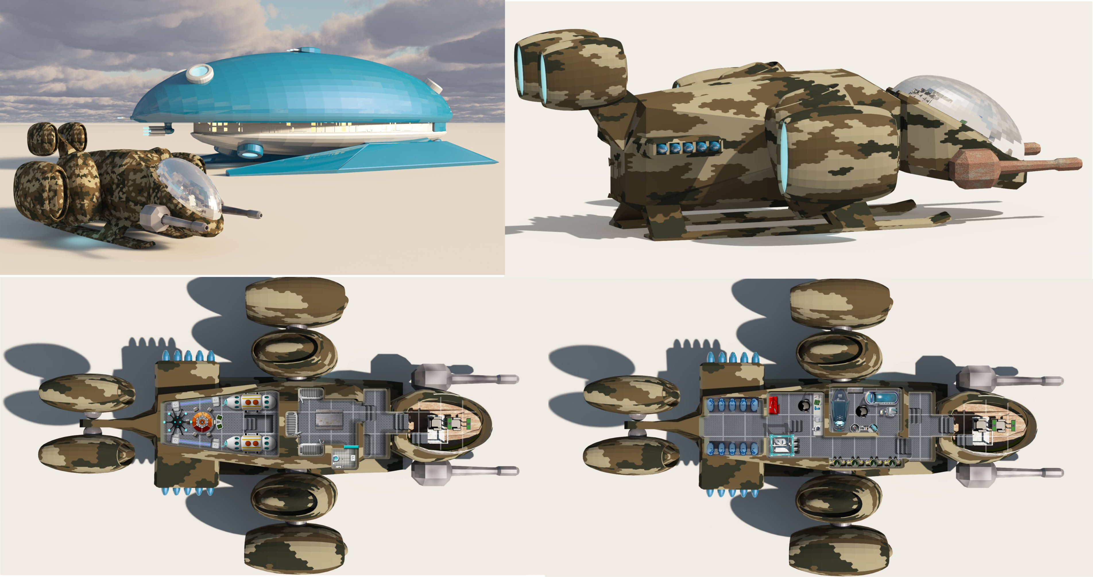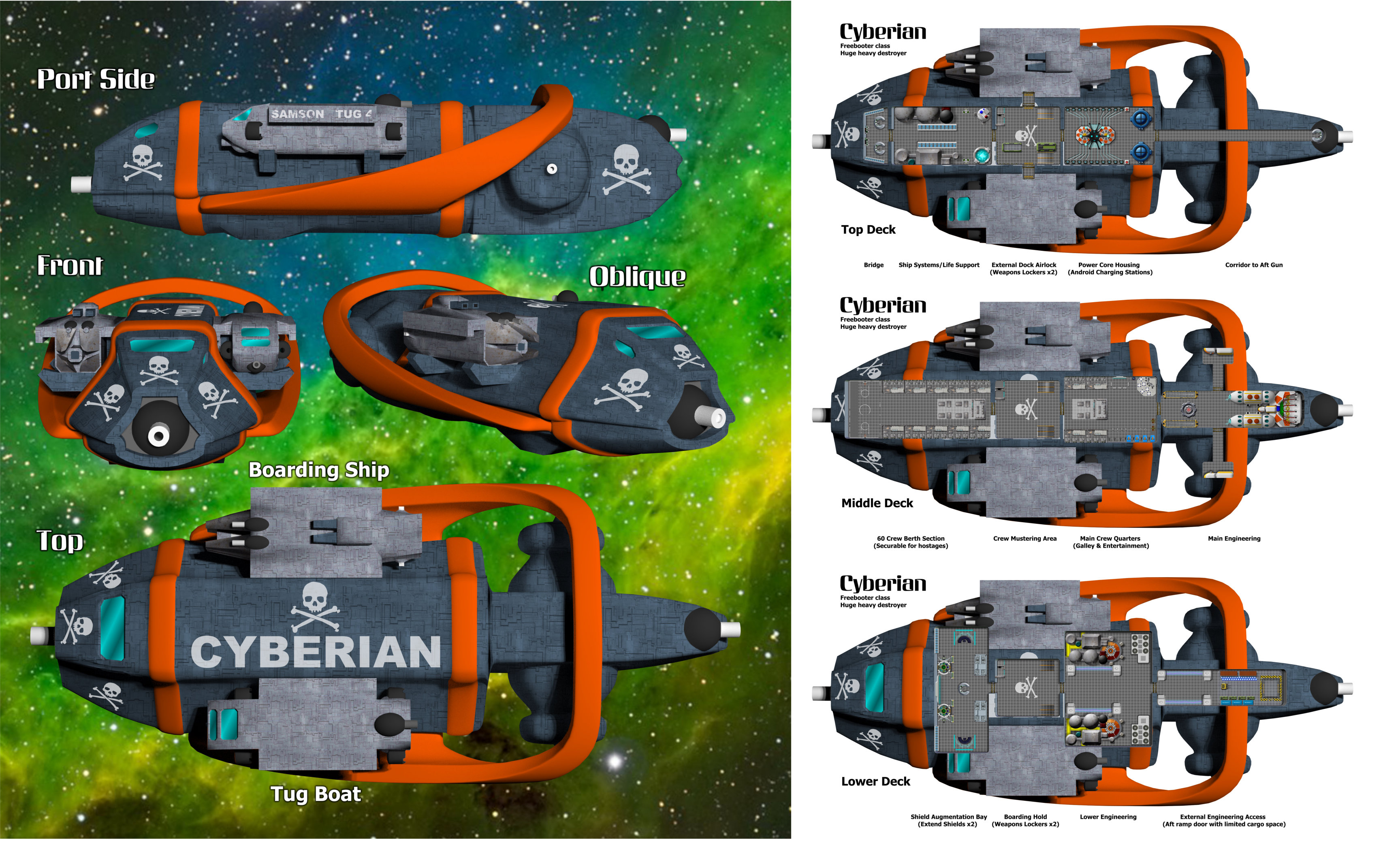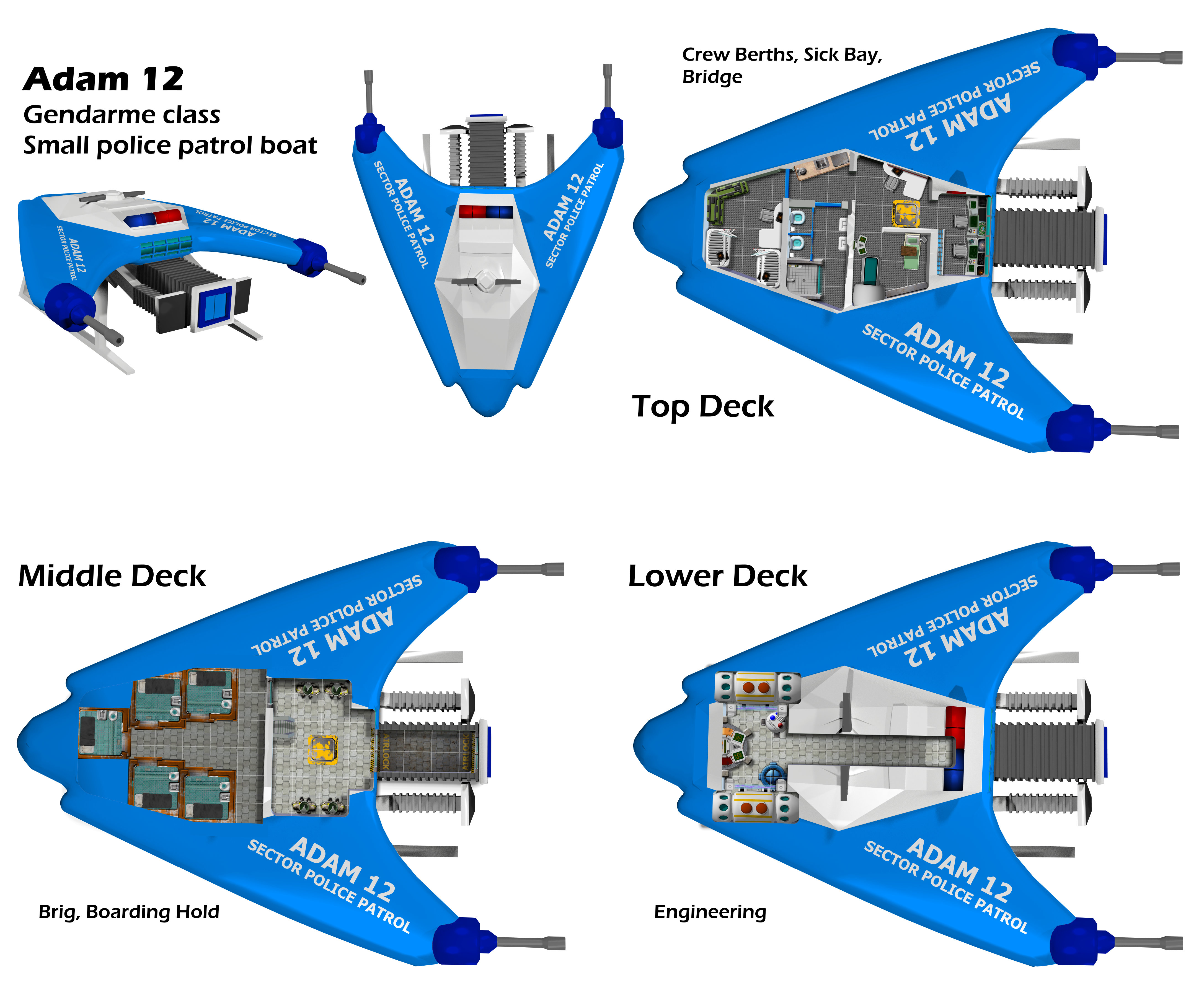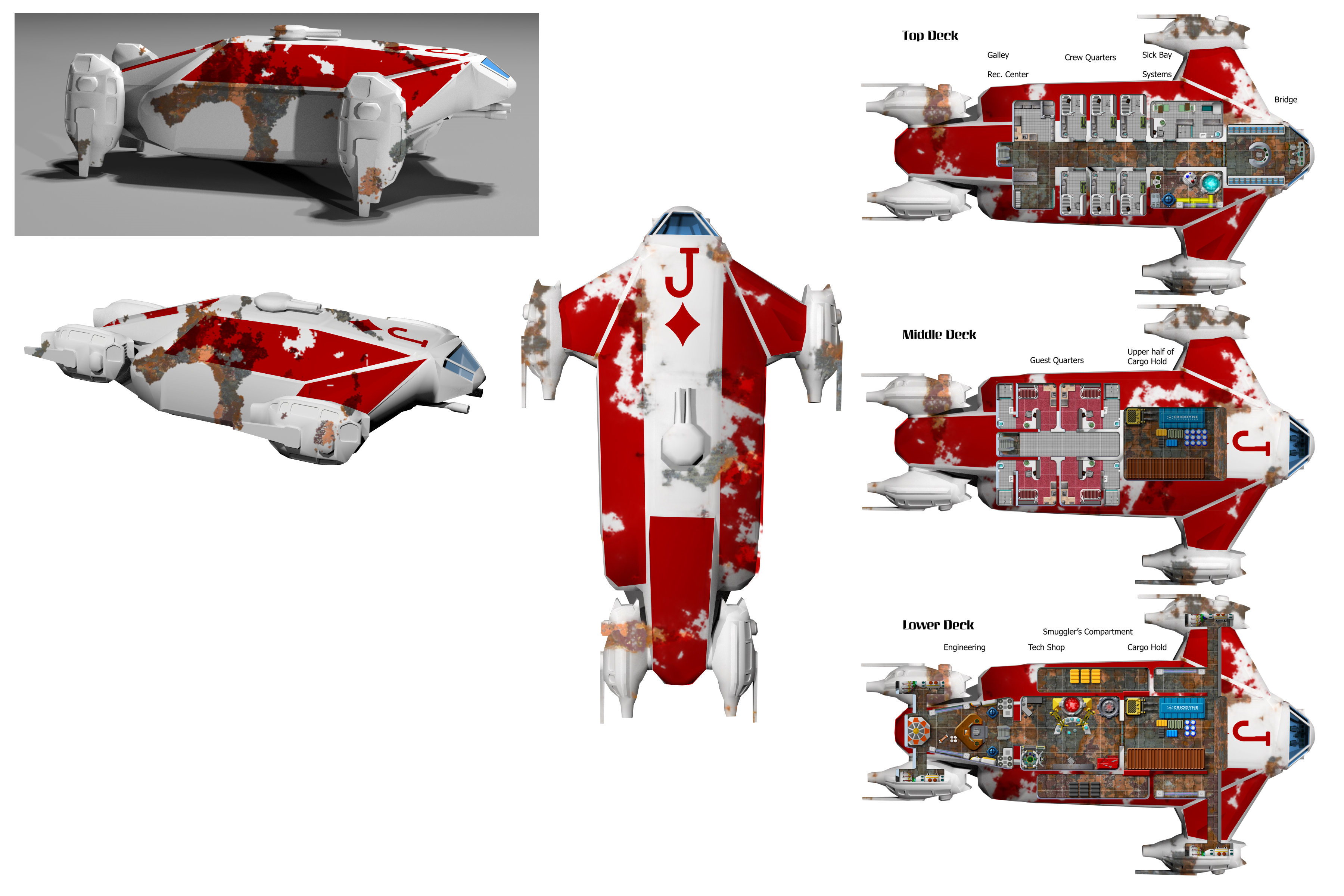 Anyway, the ship is called the Jack of Diamonds, a pitbull class smuggler transport. It's got 3-ish decks, the middle deck is tucked to the rear holding 4 guest quarters, the lower deck being cargo, tech shop and engineering, and fore part intersects where the middle deck would be for taller cargo, also the Smuggler's Cache is split in two, flanking the tech shop bay, and hidden by structurally camoflaged bulkheads as doors, with "traps" like power shorts that knock the deck lights out, when the authorites are trying to find the cache, but their investigations cause "mechanical problems" - they ought to stop what their doing (it's well hidden) . Upper deck is the crew and bridge deck.