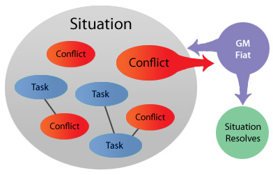 We can posit exceptions. A very disciplined GM, with very transparent fiction (setting, situation, NPCs), might make task resolution work for vanilla narrativism. I don't think it will be trivial. Rolemaster looks superficially like task resolution, but some of the features of its non-combat resolution charts actually push it closer to conflict resolution in some arenas (especially social). Nevertheless, using it for vanilla narrativism still raises some of these GM-as-glue problems. I say that on the basis of nearly 20 years of experience with the system.