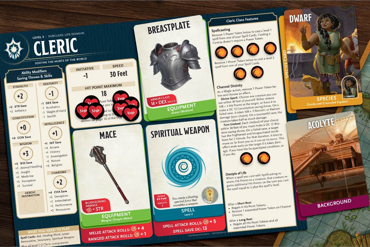 The card itself includes your basic stats--ability scores, saving throws, skills, hit points, speed, and so on. There are also clearly marked spots where you can place cards for your armor, your spells, and other things. There's also a space over on the far right for species and origin cards.
