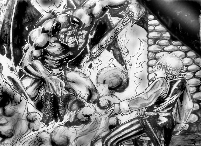 At its deepest point, in a cleft which had been hewn into the bedrock by some unknown force, lay the now-sealed gate to Azzagrat; above it lay the summoning rooms, with a jackal-headed arcanadaemon confined in a circle of binding by Mileze long before. There was a cavern in which eerie shades moved across still waters; a repository of tomes written in dead and forgotten languages; a forge, where Ainhorr had maintained a team of Azer smiths; quickling warrens, and chambers filled with torture devices. An armory of Faerie weapons, in a vault which was guarded by a symbol of insanity placed by Mostin, now housed the ten-foot vorpal sword Heedless.