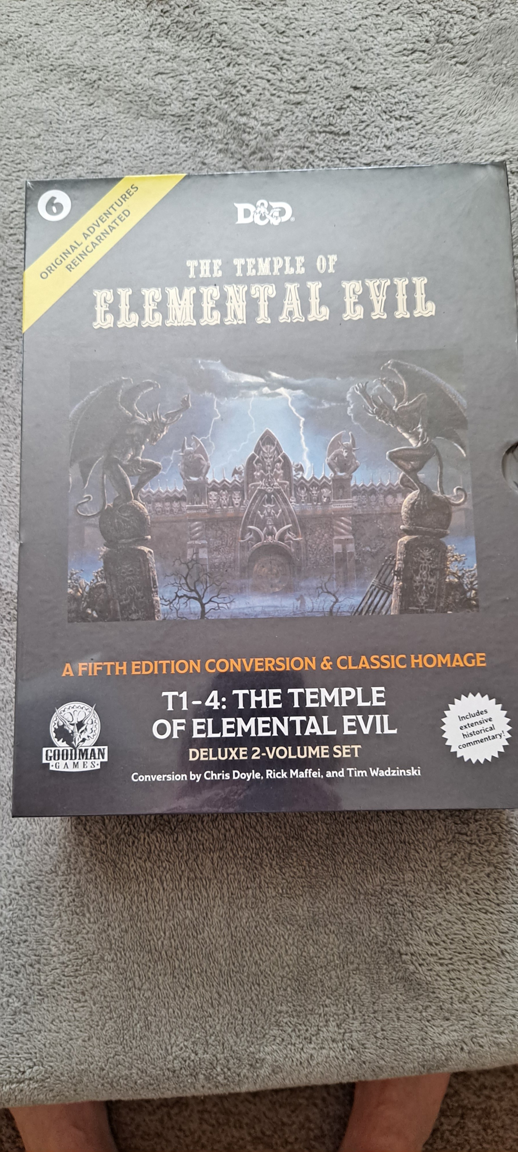 Unlike the previous five volumes in the OAR line, the sheer size and scope of this module requires something new: OAR #6: The Temple of Elemental Evil will be released as a two-volume hardcover slipcase edition. The two volumes will also contain expert commentary about the original modules and their history."