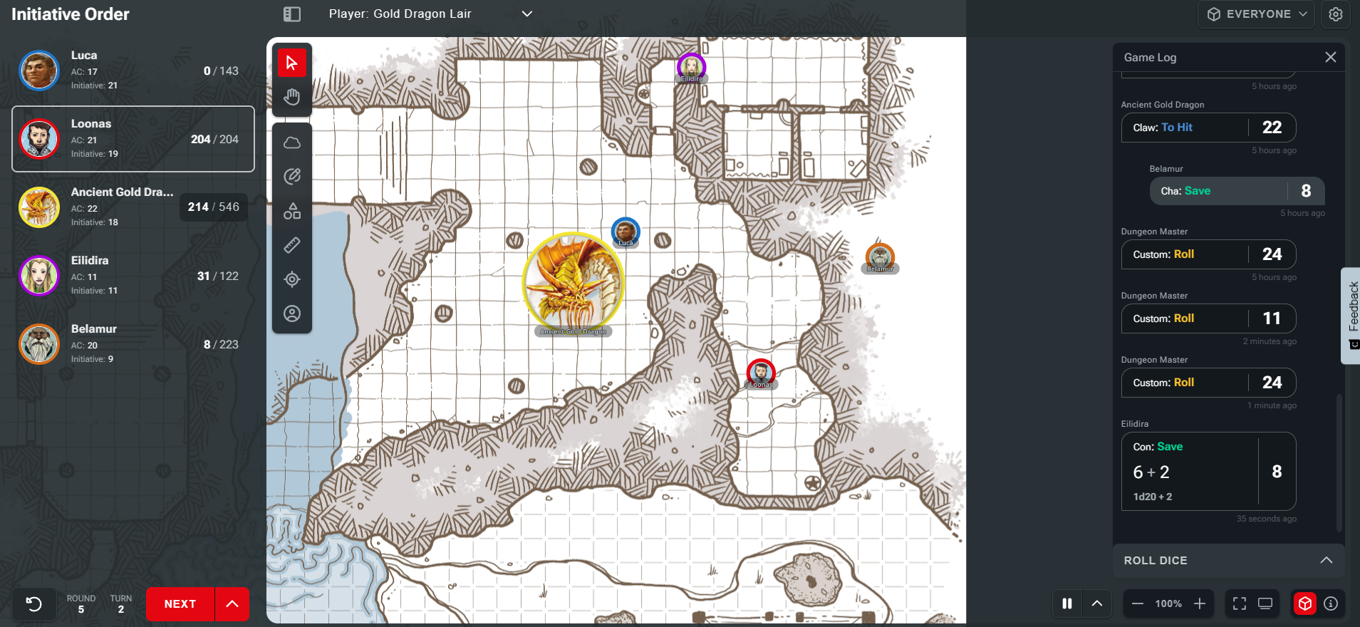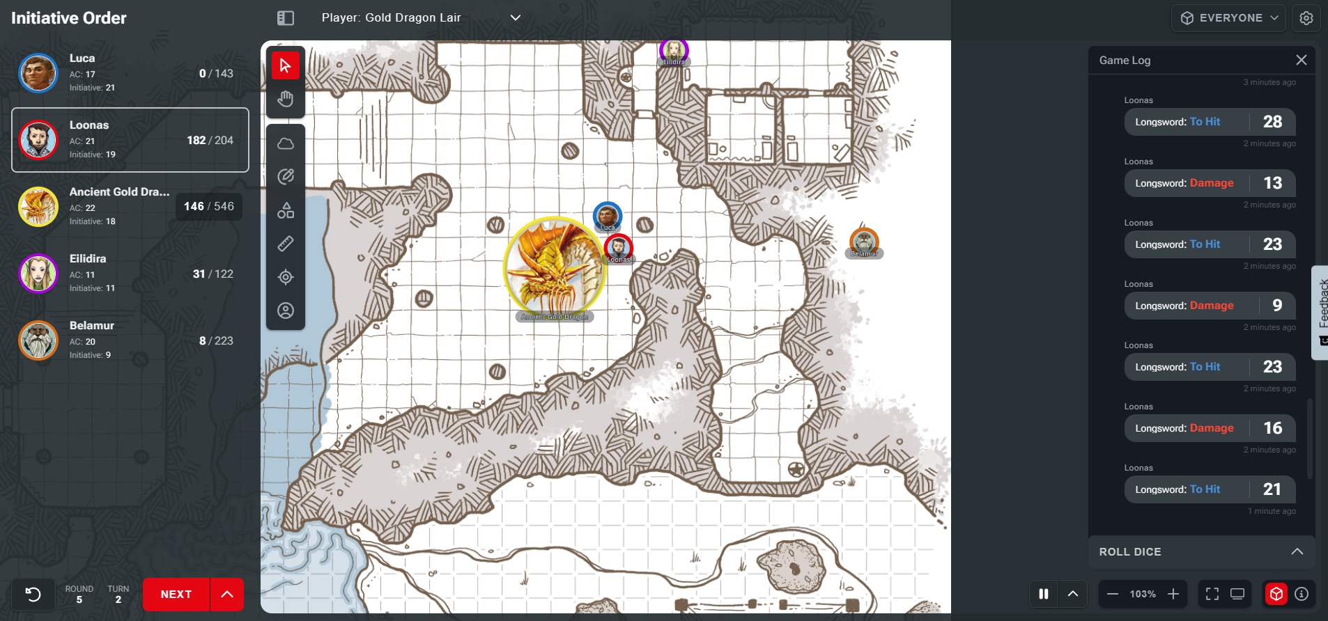 Loonas uses his tactical shift to catch up again, and is much more unlucky with his attacks against the Dragon, he can turn one of them into a hit, but it does not solve the problems with others missing. He action surges to try and get more damage in, and takes only minor damage from the Pounce in return.