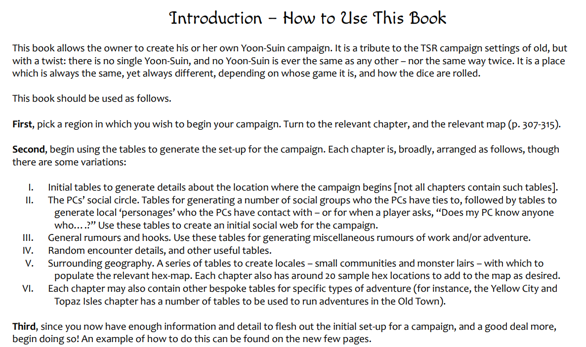 See, this is how I feel about it. I was doing a bit of a nostalgia dive into my 3e books collection and I realized pretty quickly how much I do not want those kinds of books anymore. I've got, for example, pretty much the entire run of Scarred Lands. LOVED the setting. ADORED it. Reading it now? Zero interest in running it because I realize that despite having all this lore and background and whatnot, any campaign I build in Scarred Lands is going to be me pretty much home brewing 100% of the campaign. Sure, it will draw on various Scarred Lands ideas, but, since there are almost no actual, practical, usable elements in the books (other than monsters I suppose), I'm stuck writing 99% of everything myself.