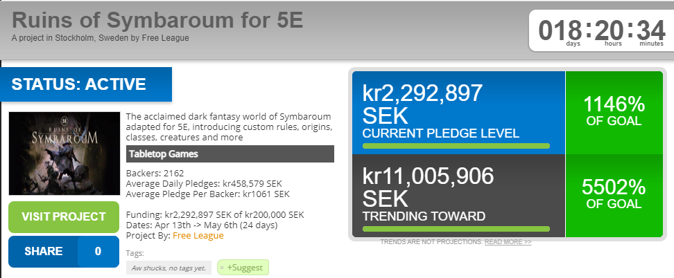 Free Leagues latest Kickstarter "Ruins of Symbaroum for 5e" is trending towards a million Dollars according to Kicktraq.. That will create a healthy lead on the leaderboard.