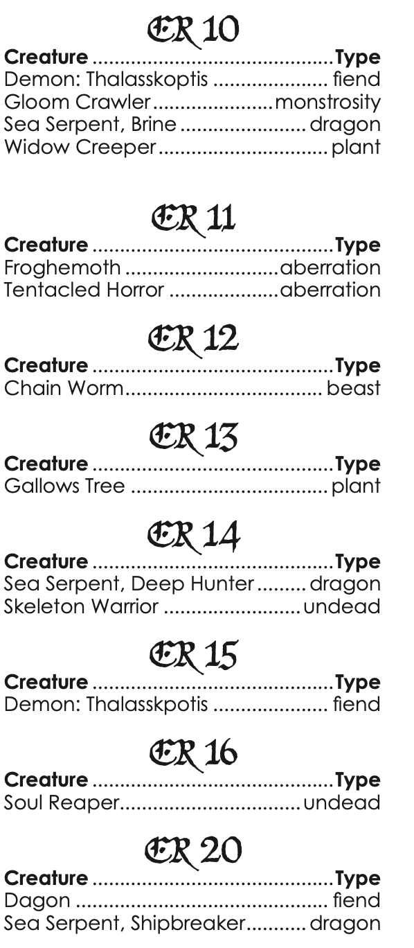 | Coastline Reaper | Large | Monstrosity | Unaligned | 9 | ToB3 | 92 | Coastal, Underwater |