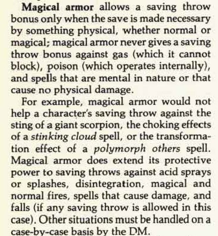 (My personal favorite was found in the saving throws section of the 2e PHB, where it allowed you to add your armor's magical bonus to saving throws, which I'll put here).