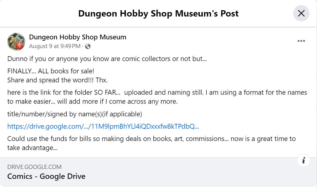 Someone at the DHSM is selling off a comic book collection with hundreds of issues in it, because they "could use the funds for bills". I assume it's Lanasa's, but I've never heard him brag about a comic collection before. The post makes it looks like just about anything in the DHSM is up for sale as well.