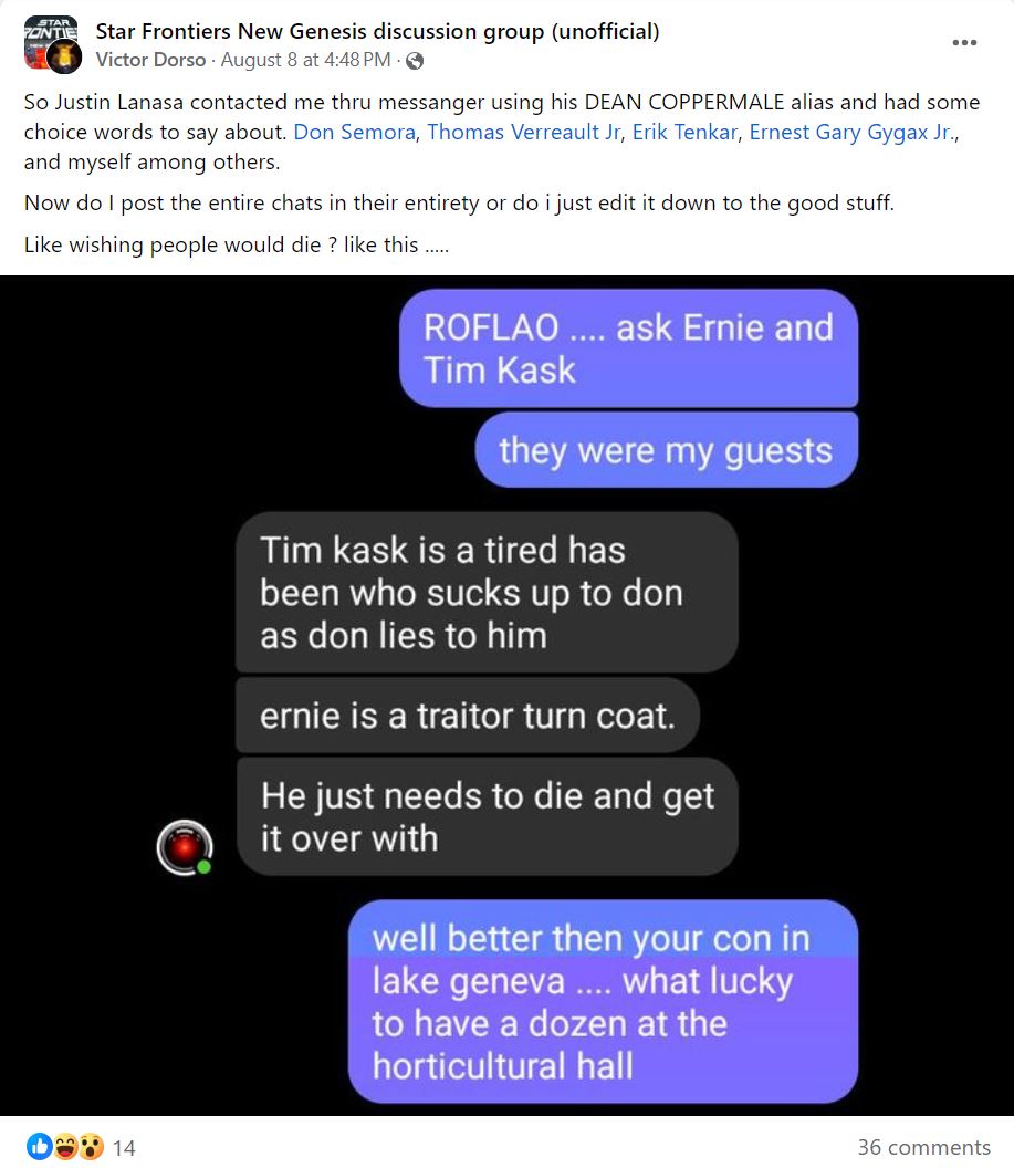 • January 10th 2022. TSR3's Justin LaNasa sends TSR alumn Tim Kask a profane message, telling him to "Go suck Lukes/wotc/balls you f*****g coward" and accusing him of having been fired from TSR for stealing.
