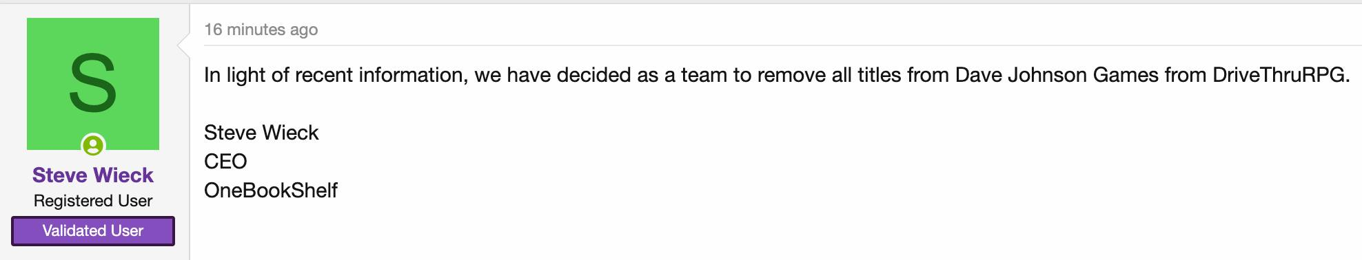 • May 17th 2022. DriveThruRPG removes all Dave Johnson Games titles from the platform.