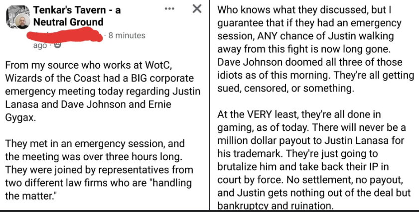 If this is true, it's pretty bad for Justin and crew. As I mentioned in the discussion, IANAL, but I imagine that taking WoTC IP and presenting it in clearly racist ways could be damaging to WotC's product. And why it's plausible that WoTC did have an emergency meeting after all these previews came out.