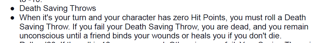 I think what they mean is "If you fail your Death Saving Throw, you are dead. If you don't die, you remain unconscious until a friend binds your wounds or heals you."