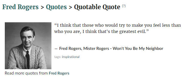 Mr. Rogers is downright sacred around here, and it makes my blood boil seeing his words in Not-TSR's mouth. I would point out two other quotes of his:
