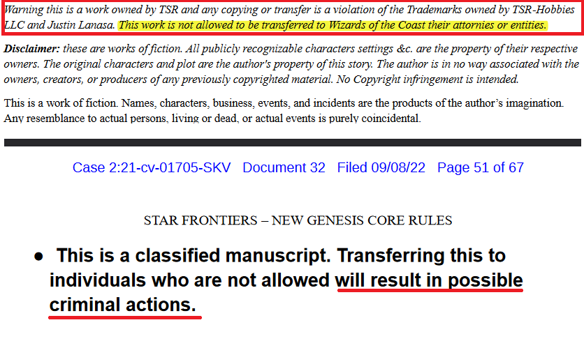 • September 8th 2022. WoTC files an injunction to prevent LaNasa or his companies from “publishing, distributing, or otherwise making available Star Frontiers New Genesis or any iteration of the game using the Marks”.