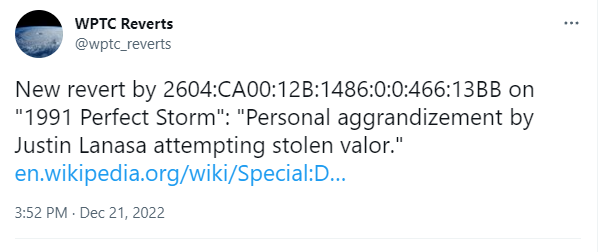 So Justin tried to modify the Wikipedia page for the "Perfect Storm" by inserting himself as being involved. Provided no citation, so they didn't exactly take it well.