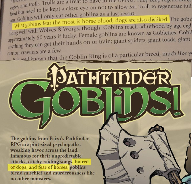 Now, it's worth noting that neither of these products really introduced new lore - but for example, the copy for Pathfinder Goblins is the main product that I can find which features listing their fear of horses and hatred of dogs together in one line, right up the front of the product in a manner that is... hauntingly similar.