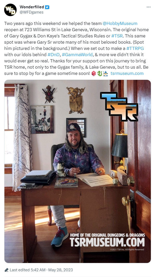 • March 4th 2022. WotC strikes back with a lawsuit naming TSR, Justin LaNasa personally, and the Dungeon Hobby Shop museum. WotC seeks a judgement that TSR hand over all domains, take down all websites, pay treble damages and costs, hand over all stock and proceeds related to the trademarks, and more. TSR has 21 days to respond.