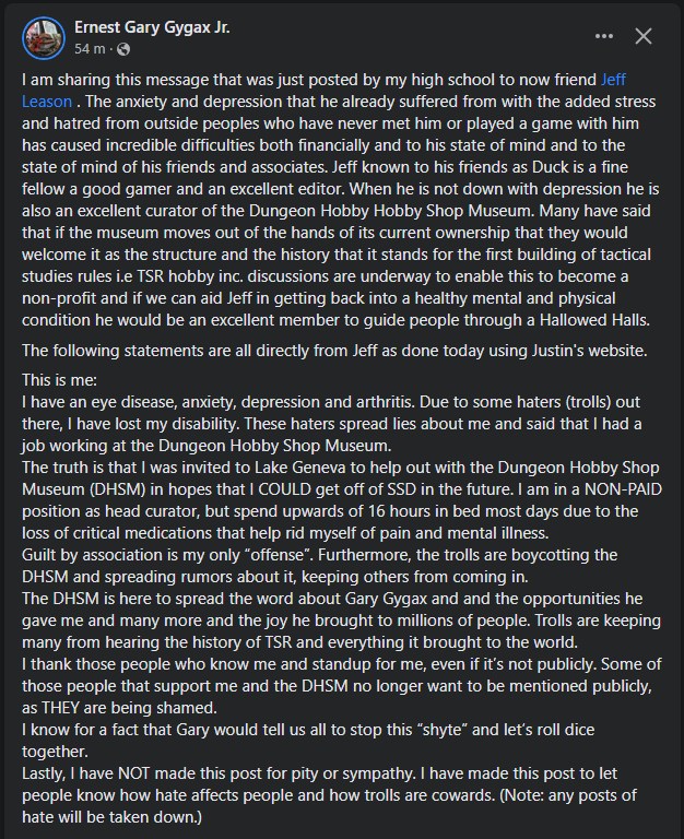 • December 11th 2021. The president of the Gygax Memorial fund publicly declares that they were never consulted, and would refuse any donation from TSR3's crowdfunding campaign. TSR3 quietly removes the references to the GMF from the IndieGoGo page.
