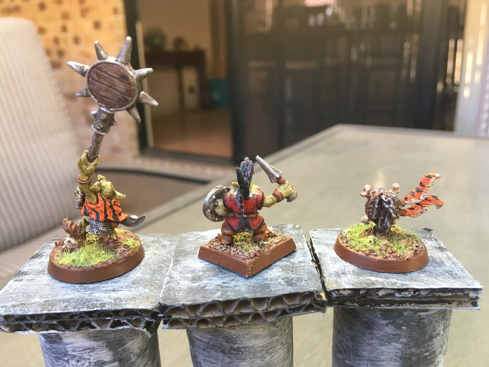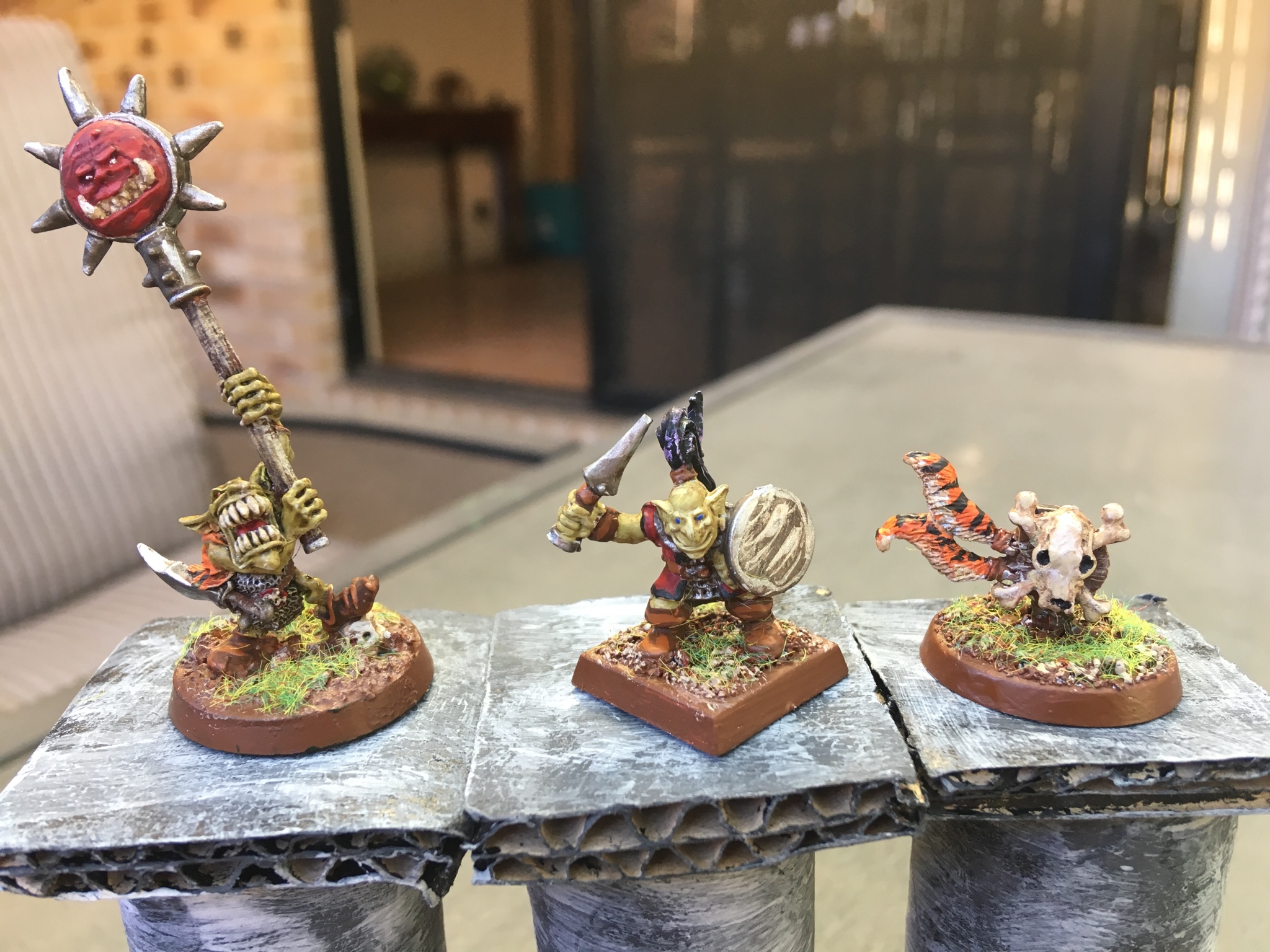 Now with extra totems! I built and painted these little guys up to help test out a Warcraft-style Shaman I’ve brewed up for our group to have a play with. They are small conversions of some classic Citadel goblin minis and a coat or two of paint. Enjoy