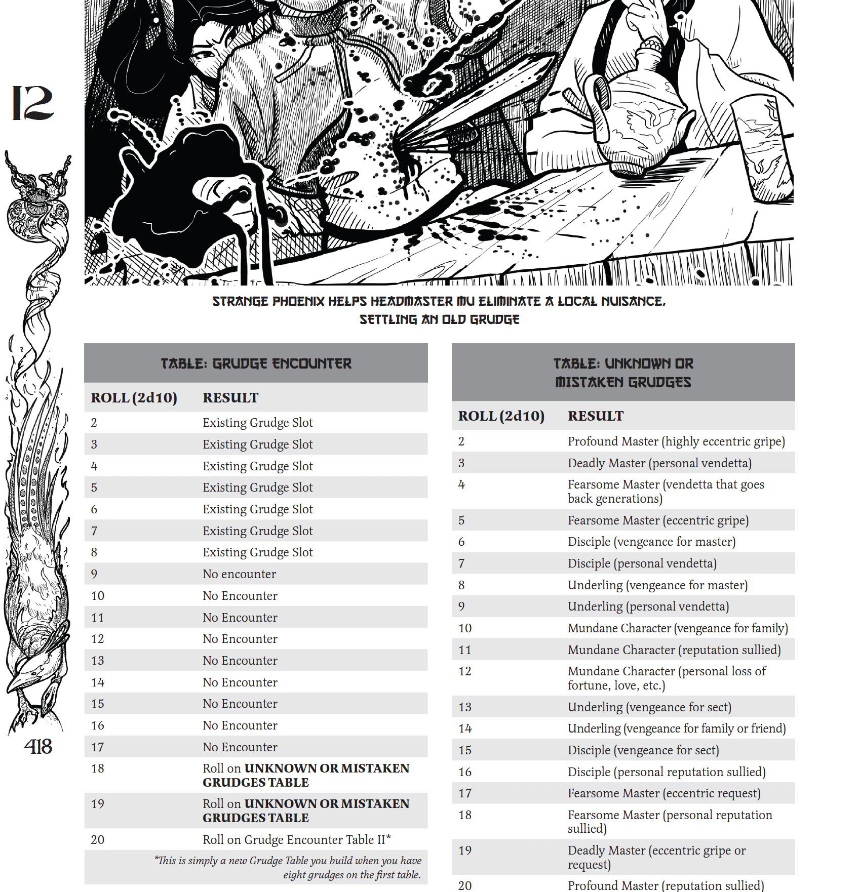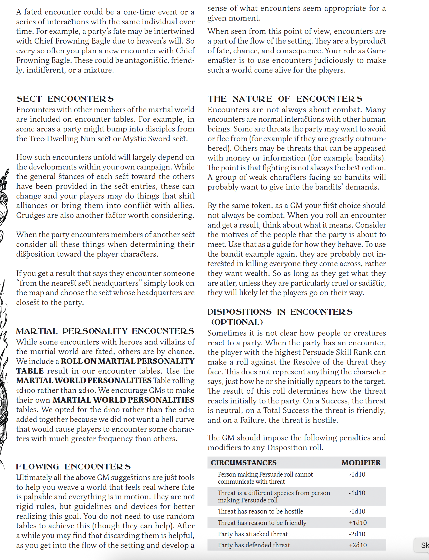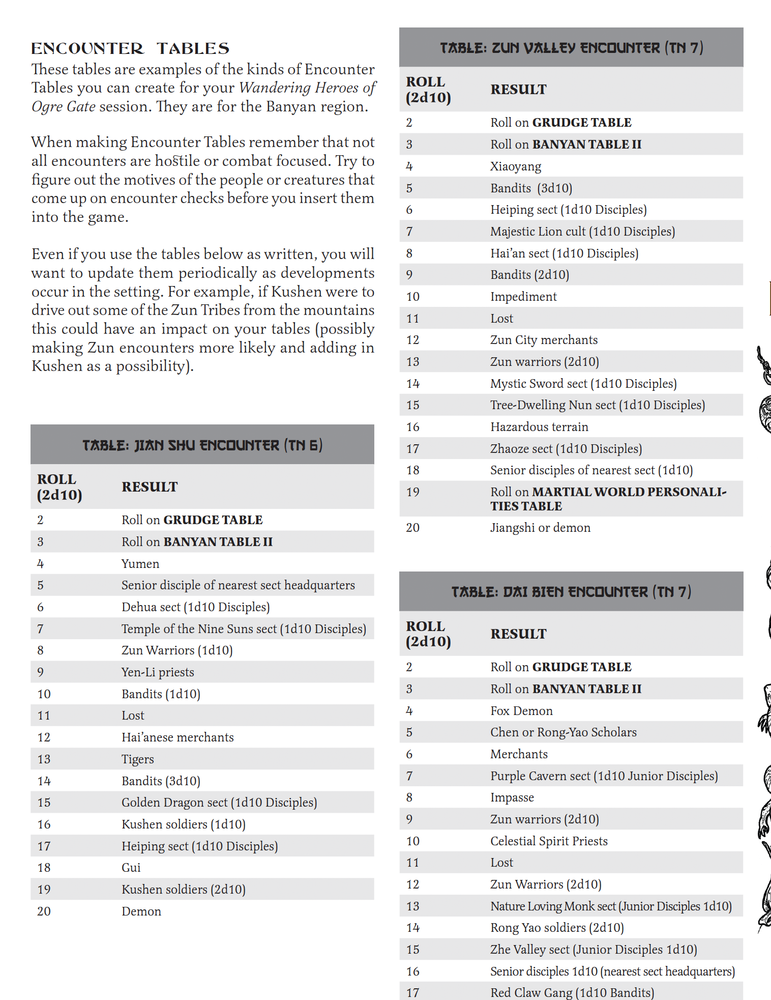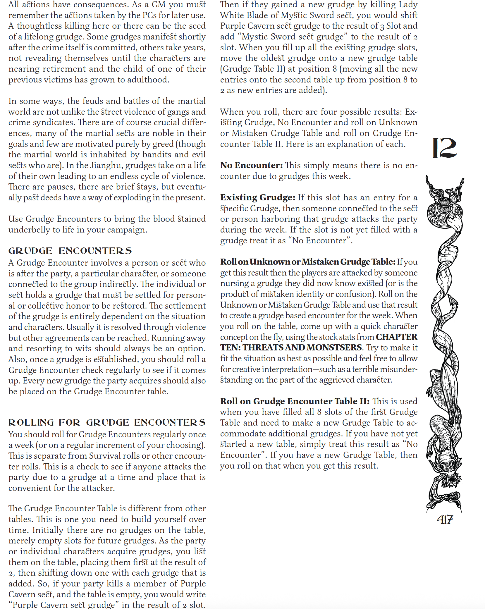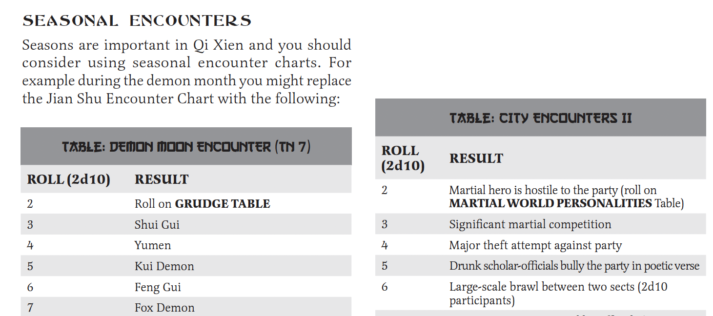 It depends on the game I am running but for my Ogre Gate Campaigns I would say they are regular but flexible. They are regular intervals, part of the Survival Skill, but I also view them as tools, so there are times when I might approach them differently. Generally I find players can anticipate what they need to plan for a journey. Discussions about what method of travel (canal, river, sea, land, this route, or through this forest), what preparations to make and what route to plan out are usually a pretty big part of play and something the players have enough consistency with the plan for. I am pasting most of the encounter section from the rulebook below. Just keep in mind I wrote this stuff from like 2014-2016 I think, so some of it I still use as written, some of it I have evolved into more streamlined forms at my own table (and in later books I put out, this is reflected in sections on encounters in tables). Also I skipped over a bunch of encounter table pages here to focus on the text. The Grudge Encounters are especially important in my opinion to the feel of play.