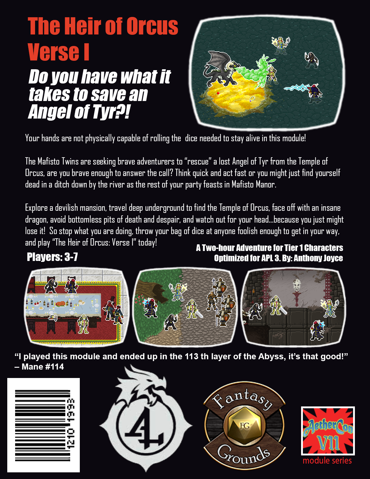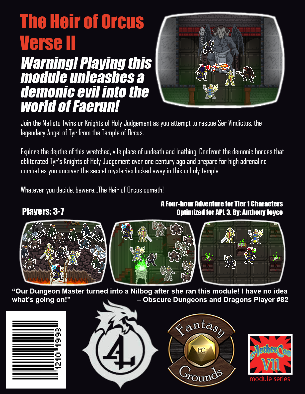 This module features three ways to play: join the Knights of Holy Judgment, the Cult of Zariel, or the forces of Chaos as you search for a lost Angel of Tyr, Ser Vindictus. Play like it is 1990 and experience the first Adventurer’s League module to use 16-bit art for maps, tokens, NPC portraits, and magic items!