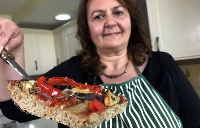 "Tiziana di Costanzo, co-founder of Horizon Insects, showing a pizza slice made from powdered crickets, London, June 2021."