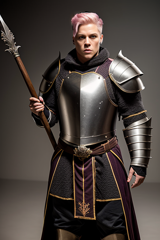 That's some decent-looking armor and weaponry! I bet if you tweak the prompt a bit, you can get that same image but with p!ink in the portrait, with the helmet tucked underneath her right arm.