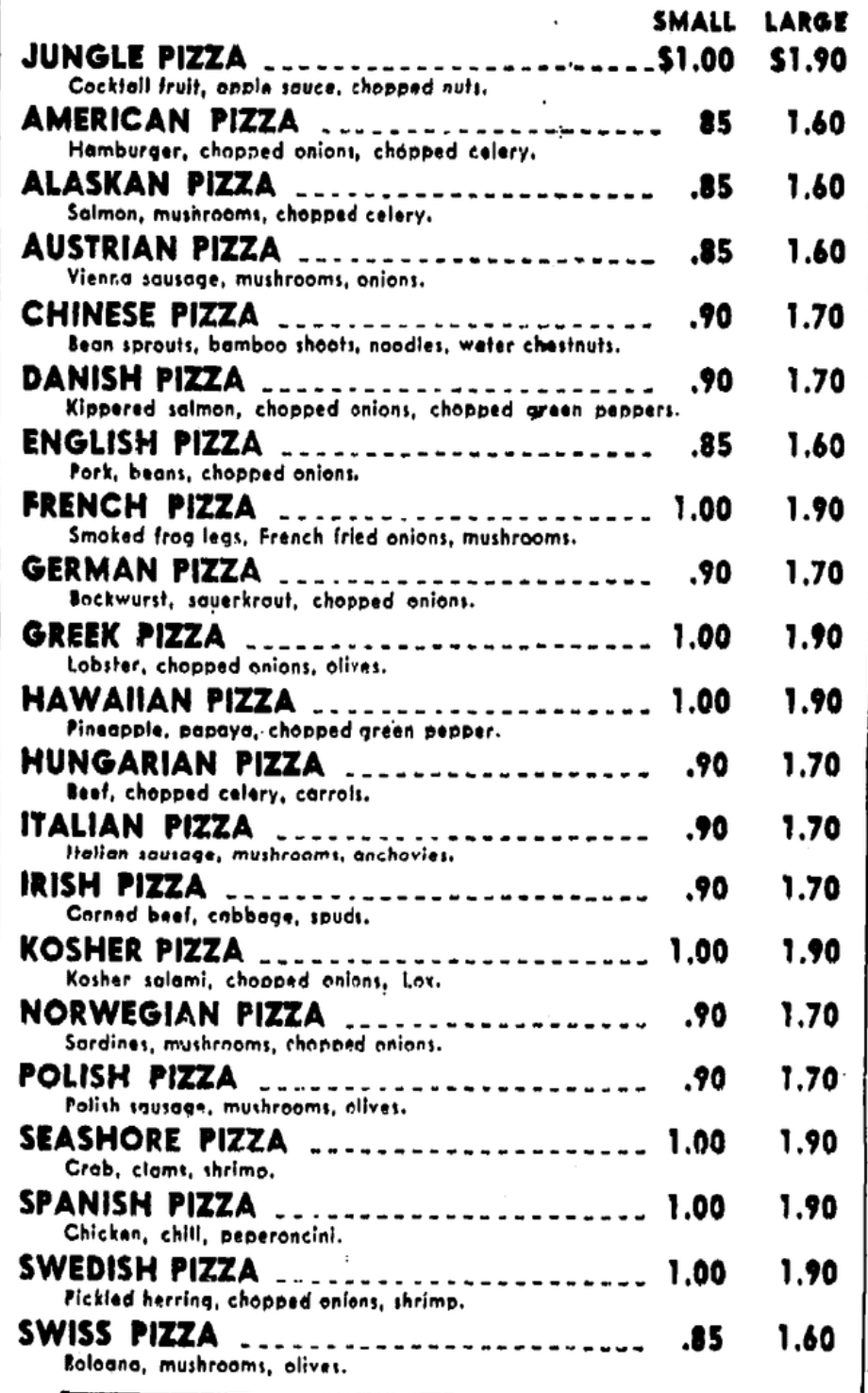 Also this menu - how long ago was this? Was Israel not formally recognised at this point that they went with Kosher? And what is the last topping on the Kosher pizza - I cannot make it out.