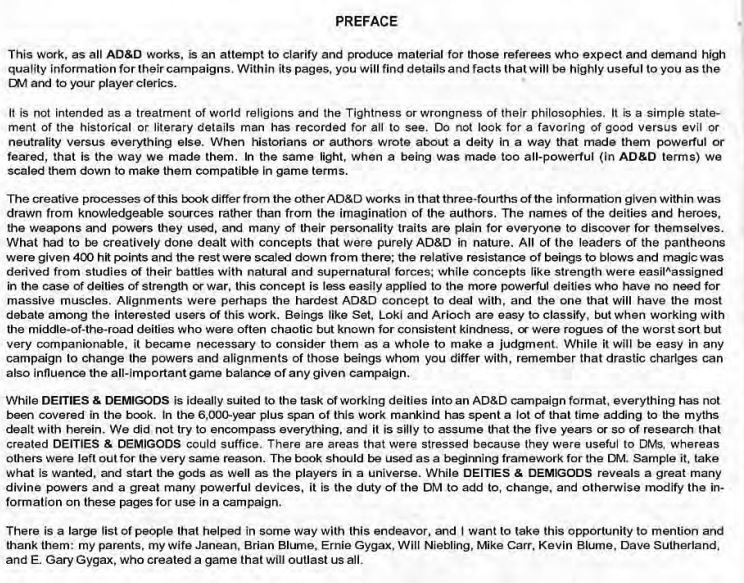 I would like to use this forum to set some small bit of controversy straight from my point of view. When I first started outlining the book, Gary Gygax told me there might be a copyright problem with the Lovecraft and Moorcock sections of the book. Gary gave me the addresses of those two groups and suggested I get permission from them to print those sections of the book. I immediately sent out the two letters and a month later got positive replies back from both groups. They were pleased to get their concepts mention in the book. I foolishly gave those letters to the TSR legal department (I wish I had them to show you now). The book was printed and published in 1980 to wide acclaim. Fans liked the mention of temples and divine magic items. They liked the references to monsters associated with this or that religion.