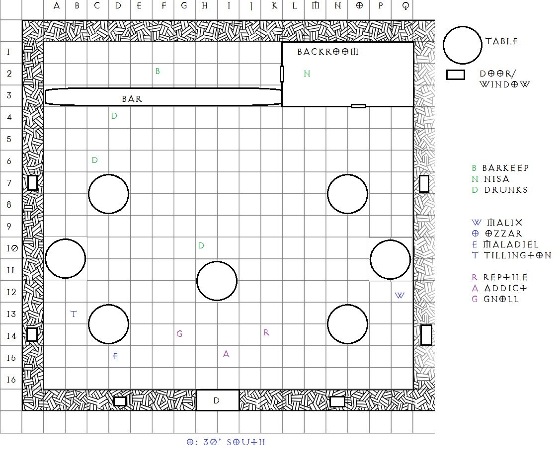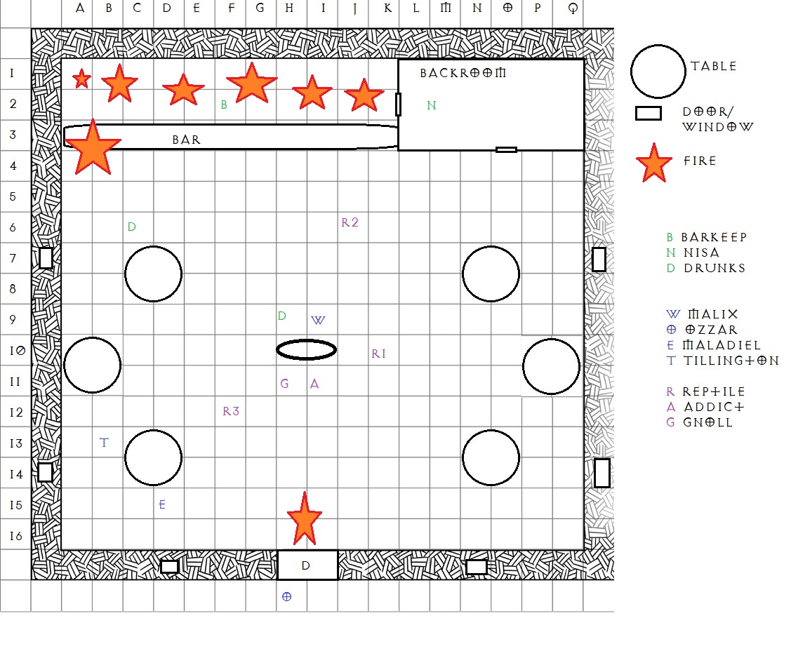 The Gnoll knocks over a table, forming a makeshift cover between it and whatever might come out from behind the back door. The Addict joins the Gnoll behind it. But strangest of all, the Reptile disrobes, instead of one large creature, it was three kobolds disguising themselves. Two of them hop down from standing on the third, and fling jars. One aims at the main door, igniting a patch of fire in the hopes of barring outside reinforcements. The other lands behind the bar, on the spirits shelf, causing the alcohol to erupt along the back walls.