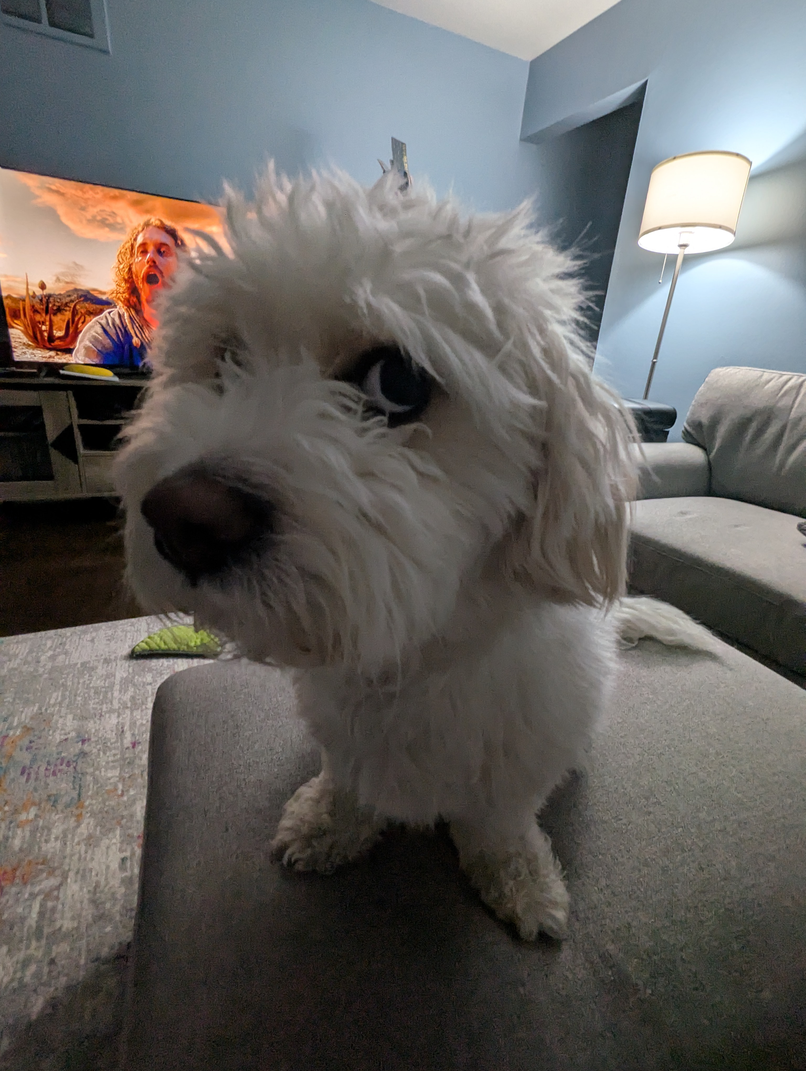 Marnie was a rescue and had a tough start in life, but she's found her forever home with us. She barks at animals on TV, barks at hats, helps bring in the groceries from the car, puts her toys away at night, loves going for rides in the car, is afraid of cats but not people or dogs, and can catch a tennis ball if you throw one before the ball even hits the ground. She's also very protective of the family, including the kiddos, which means that I can trust she's watching over them when they're playing outside.