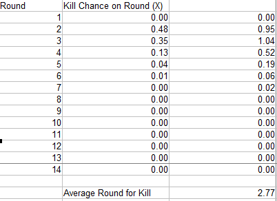 PC2 has about a equal chance (20-25% chance) to drop his enemy on the 3, 4, or 5th round with 6 + 7 adding up to about the same probability in that 91% window. So it's probably be better to estimate 5 rounds.