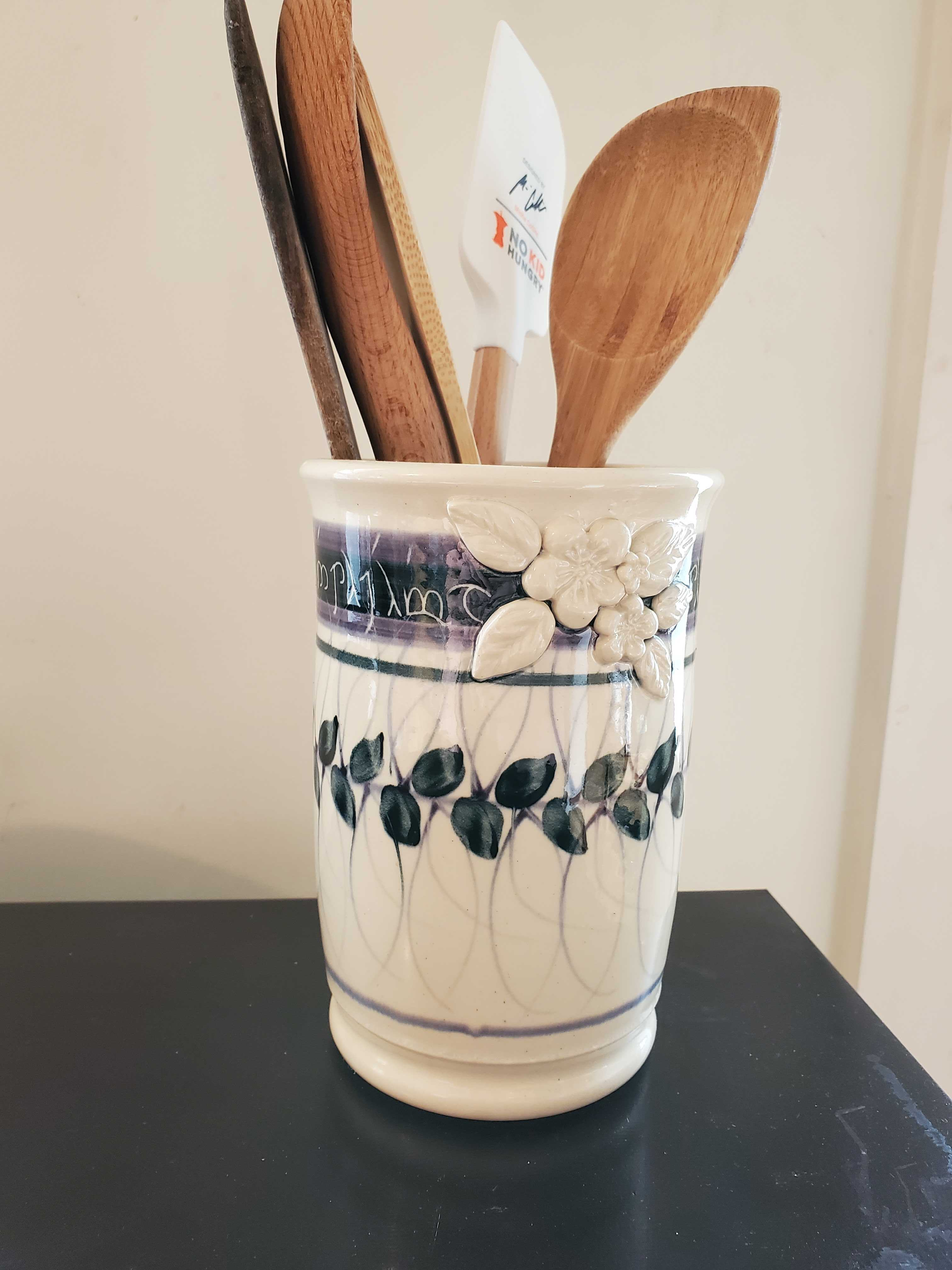 Handmade, Tolkien elvish script around the edge there, ought to be sitting on Bilbo Baggins' countertop. Totally art. Also totally made considering what the audience will think of it, specifically of a form to be displayed in your everyday life. Beautiful, nontheless. I'm happy to have found it at my local sci-fi convention art show.