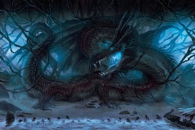 Níðhöggr can only use the swallow whole ability on creature grappled with its bite. Swallowed creatures are exposed to the poison of Níðhöggr every round they remain inside its belly. Swallowed incorporeal creatures must escape like corporeal creatures, they cannot pass through the corpse of Níðhöggr and suffer the damage of the stomach and the poison despite being normally immune. Níðhöggr can have swallowed at the same time any number of creatures as long their total space is equal or lesser than its space. Also, if a creature that is swallowed whole by Níðhöggr manages to escape by cutting itself free, Níðhöggr’s muscles simply seals over the hole created so that other swallowed creatures must cut their own way out.