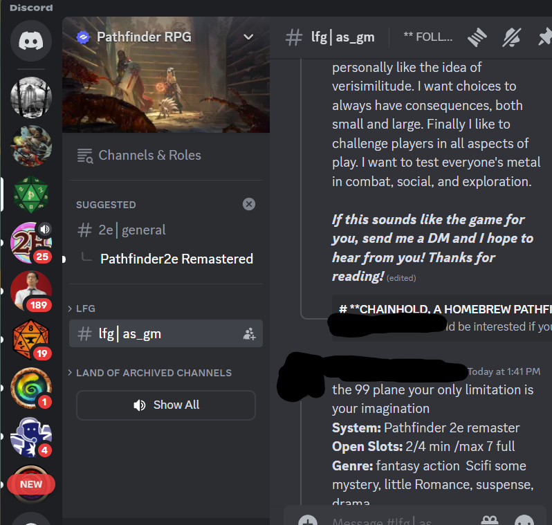 The top two channels on my list there are a game I'm in and a game I GM (which is a sever I also used to use for MMO groups).