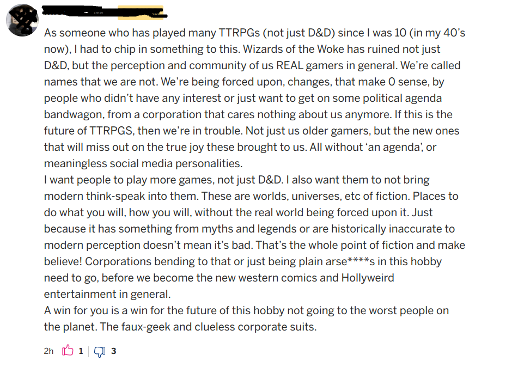 Here's the latest diatribe to appear on their indiegogo campaign page, true masterclass in gatekeeping, whiny grievance, and the worst of onion-belted, cloud-fist-shaking grognardery:
