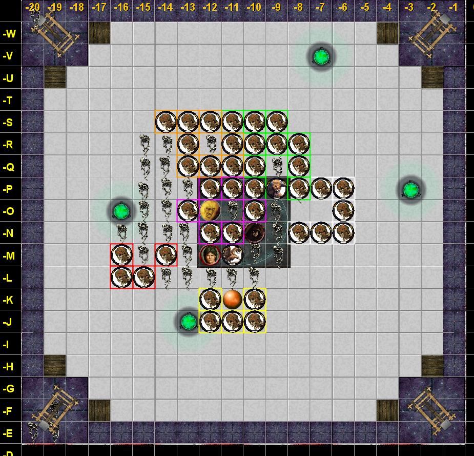 A third green-flagged skeleton tries to push past his allies to the only unoccupied space near Emral, but the sorcerer tags him with his magical dagger.