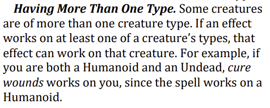 Having More Than One Type. Some creatures are of more than one creature type. If an effect works on at least one of a creature’s types, that effect can work on that creature. For example, if you are both a Humanoid and an Undead, cure wounds works on you, since the spell works on a Humanoid.