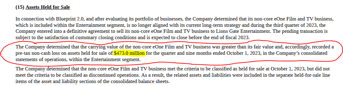 Translation: Hasbro wanted to sell off eOne, but the best deal it could get was for $473 million less than its own books recorded eOne as being worth. To make the books balance with the sale, Hasbro had to record that difference as a charge against their earnings for the quarter in which the sale was made.