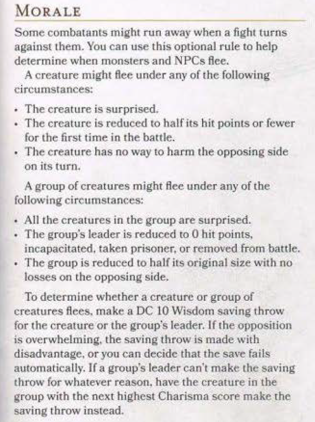 Yeah... I didn't play 4e, but as I understand it, the "bloodied" condition often as not resulted in a boost to the monster effectiveness; whereas Morale was generally about fleeing/surrendering, iirc.A lot of what people talk about sort of exists in 5E, but is either skipped over, not widely used, or outright rejected by many newer players who lack the "old-schooL' upbringing on B/X and AD&D.