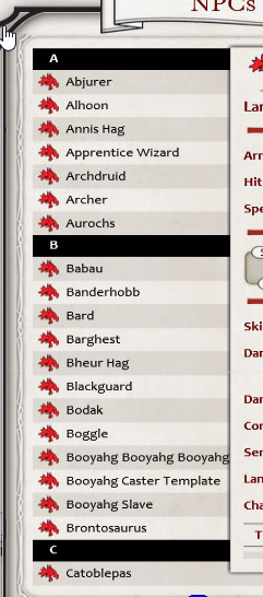It looks like this is in strict alphabetical order, and not in the order they will appear in the book, since we know the hags and the alhoon will be under "H" and "M" respectively in the actual book. I assume all the NPC-types will be in their own appendix (and there looks to be an interesting assortment of them, even in the first few letters of the alphabet). Those "Booyahg" types are goblin variants alluded to on the preview page we've seen already...