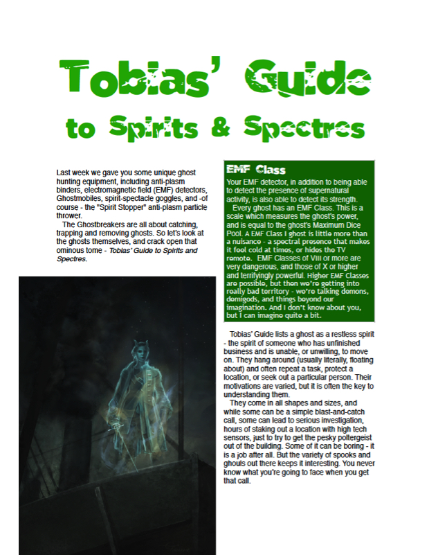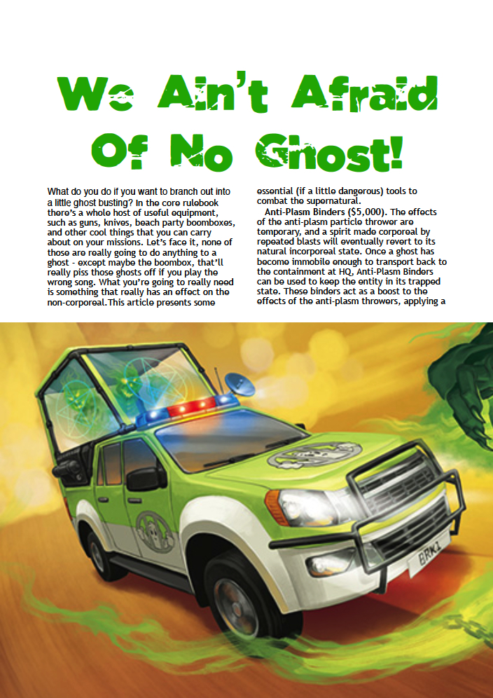 Anti-plasm binders, electromagnetic field (EMF) detectors, Ghostmobiles, spirit-spectacle goggles, and -of course - the "Spirit Stopper" anti-plasm particle thrower. All essential equipment for the WOIN RPG for the budding chaser of ghosts, spirits, and other paranormal entities. By David F Chapman.
