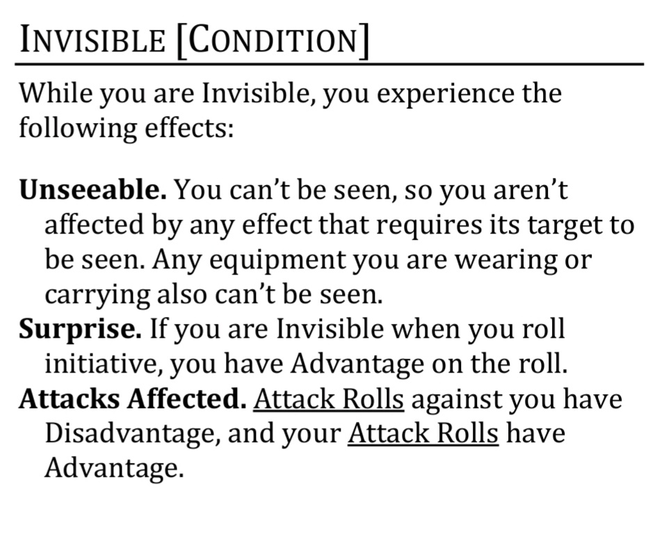 I'm starting to wonder if the bolded is in fact the whole point of this exercise: a massive nerf to Invisibility.Regardless of what the condition is called or how you interpret the fictional explanation for what is causing you to receive the condition’s benefits, a creature with the condition must still benefit from them while in a position where another creature with normal vision could otherwise see them, or else the invisibility spell would be useless.